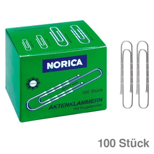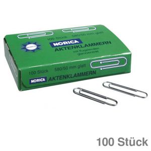 Brief-, Aktenklammer. Ausführung der Form: gewellt, rund, mit Kugelenden. Werkstoff: Metall, galvanisiert. Sie schützen das Schriftgut beim Abziehen der Klammer. Länge: 77 mm. Farbe: silber