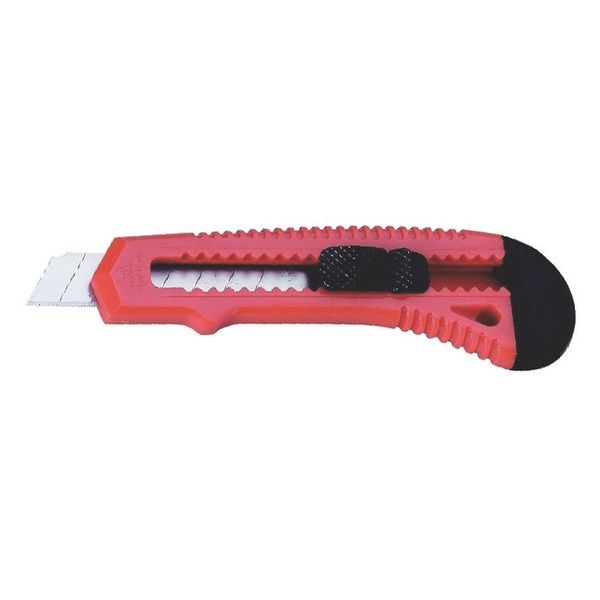 Kunststoffcutter mit 18 mm-Klinge für leichte bis mittlere Schnitte. Lange Metall-Messerführung. Schieberaster arretierbar. Klingenabbrecher. Farbe: rot.