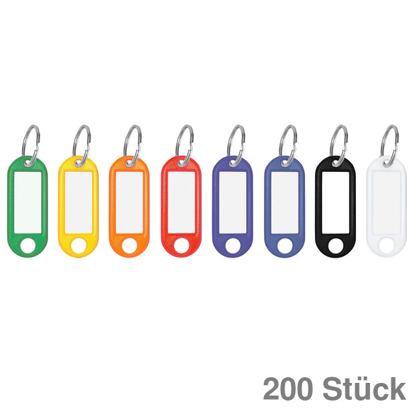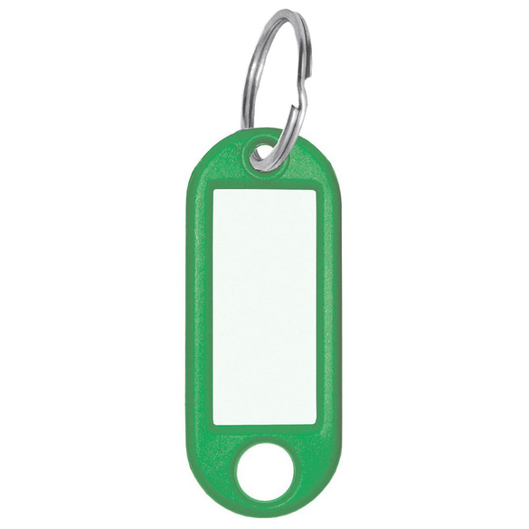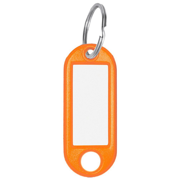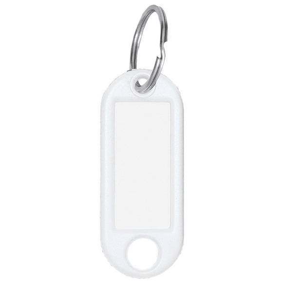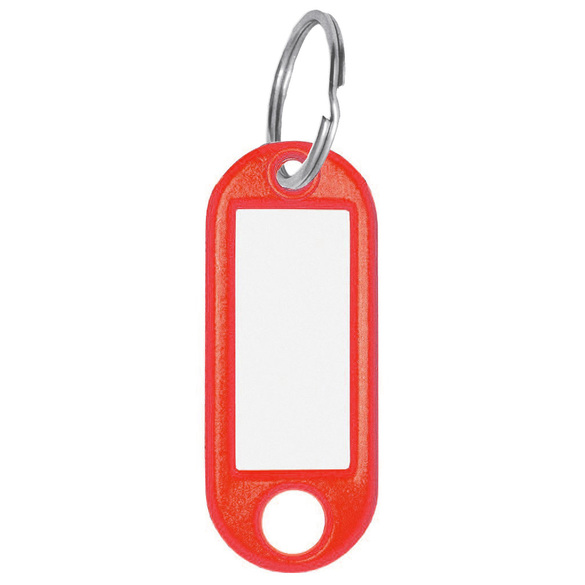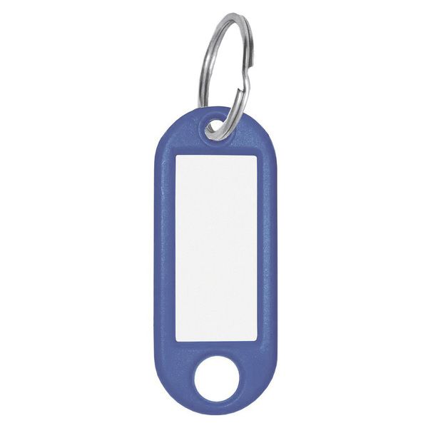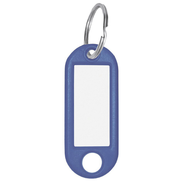 Schlüsselanhänger aus Kunststoff mit auswechselbaren, beschriftbaren Etiketten. Farbe: blau