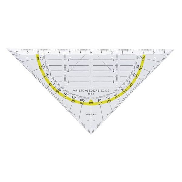 Geometrie-, Zeichendreieck (Büro, Schule). Werkstoff: Kunststoff. Ausführung der Tuschenoppen: transparente Gumminoppen. Farbig hinterlegte Winkelgrade vorhanden. Griff vorhanden. Länge der Hypotenuse: 16 cm. Farbe: transparent.