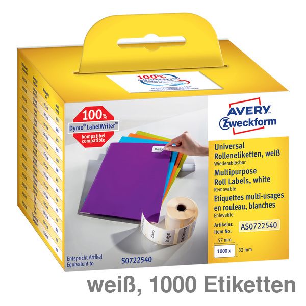 Die weißen Rollenetiketten von AVERY ZWECKFORM bieten Ihnen für jeden Bedarf das passende Etikett. Die Rollenetiketten zeichnen sich durch eine überdurchschnittlich gute Klebkraft aus (gemessen nach FTM2 und FTM9 auf allen gängigen Oberflächen). Sie sind frei von Bisphenol A (BPA). Wir garantieren vollste Zufriedenheit für die Avery Zweckform Rollenetiketten, oder Sie erhalten Ihr Geld zu 100 % zurück (Teilnahmebedingungen unter www.avery-zweckform.de). Drucken Sie je nach Bedarf einzelne oder auch mehrere Aufkleber schnell und einfach selbst.