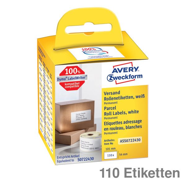 Die Rollenetiketten AVERY ZWECKFORM eignen sich besonders zum Versand von Paketen. Die Rollenetiketten zeichnen sich durch eine überdurchschnittlich gute Klebkraft aus (gemessen nach FTM2 und FTM9 auf allen gängigen Oberflächen). Sie sind frei von Bisphenol A (BPA). Wir garantieren vollste Zufriedenheit für die Avery Zweckform Rollenetiketten, oder Sie erhalten Ihr Geld zu 100 % zurück (Teilnahmebedingungen unter www.avery-zweckform.de). Gestalten und drucken Sie je nach Bedarf einzelne oder mehrere Paketaufkleber schnell und einfach.