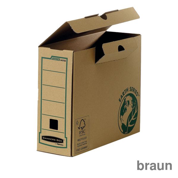 Archivschachtel Bankers Box® Earth Series. Ausführung des Inhalts bzgl. der Hauptausstattungsteile: mit Klappdeckel und Verschlusslasche für höhere Sicherheit und Archivdruck. Werkstoff: 100% FSC zertifizierter recycelter Karton. Verwendung für Papierformate: A4. Größe (B x H x T): 103 x 254 x 319 mm. Farbe: braun. Lieferung gefaltet. Forest Stewardship Council (FSC).