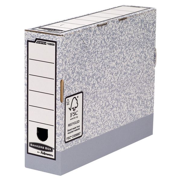 A4 Archivschachtel 80mm Bankers Box® System. Ausführung des Inhalts bzgl. der Hauptausstattungsteile: Deckel mit Verschlusslasche für höhere Sicherheit. Mit Archivdruck. Automatischer Fastfold(TM) Aufbau, kompatibel mit Bankers Box® System Archivboxen und -container. Werkstoff: 100% recycelter Karton. Verwendung für Papierformate: A4. Größe (B x H x T): 85 x 327 x 265 mm. Farbe: grau. Lieferung gefaltet. Forest Stewardship Council (FSC).