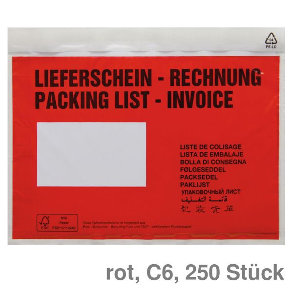 Dokumententasche Lieferschein-Rechnung/mehrsprachig DIN C6 175 x 140 mm (B x H) LDPE, recycelt rot 250 St./Pack. Zum Anbringen von Begleitpapieren außen an der Sendung.