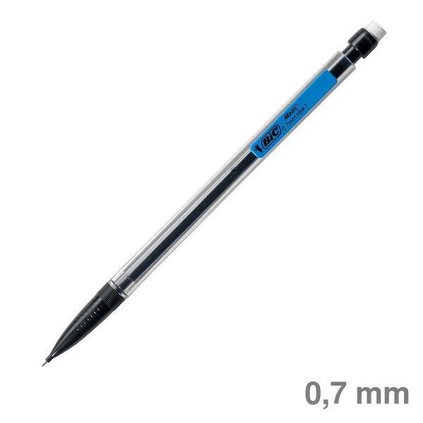 Druckbleistift BIC® Matic®. Ausführung: Mine auswechselbar, Druckmechanik. Material des Schaftes: Kunststoff. Mit Radierer und Clip. Clipfarben 3-fach sortiert: rot, gelb, blau, grün, orange. Inklusive 3 Minen. Farbe des Schaftes: transparent/schwarz. Stärke der Mine: 0,7 mm. Bezeichnung der Härte: HB.