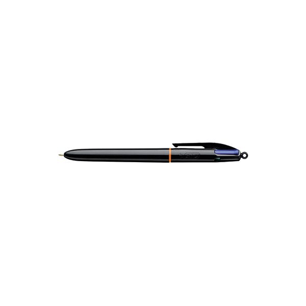 4-Farb-Druckkugelschreiber in Schwarz für den Office-Bereich. Farbige Drücker für einfache Farbauswahl. Runder Schaft. Nachfüllbar. Dokumentenechte Tinte (ISO 12757-2, Blau, Schwarz und Rot). Schreiblänge: durchschnittlich 8 km. Strichstärke: 0,4 mm