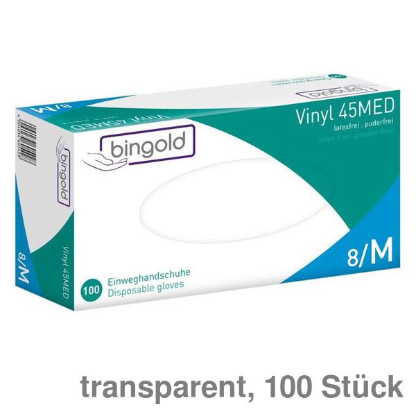 Der BINGOLD Vinyl 45MED Einweghandschuh transparent ist puderfrei, beidhändig tragbar, nur für den Einmalgebrauch bestimmt, unsteril und gemäß EN 455 produziert. Da der Handschuh frei von Latex-Proteinen und Beschleunigern ist, handelt es sich hier um eine gute Alternative zu Latex-Handschuhen, besonders für Menschen mit Typ-1 Latex-Allergien.