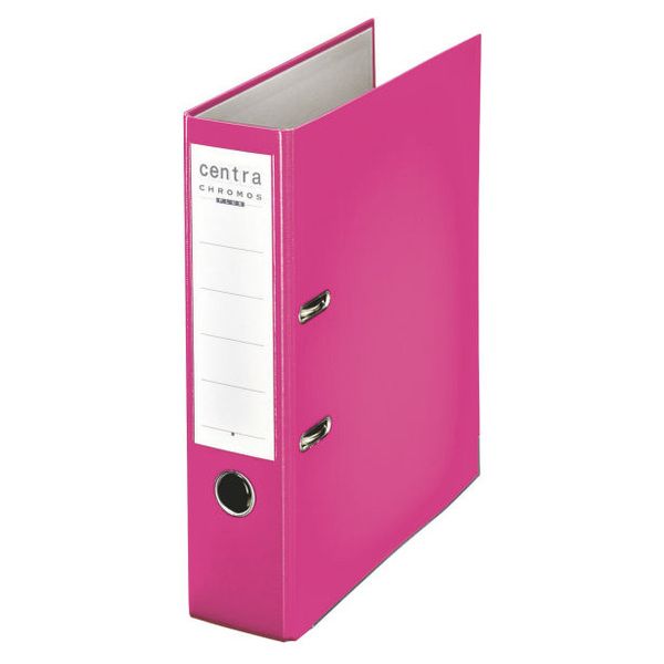 Ordner Plastik Chromos, mit Hebelmechnik. Mit Schlitzen, mit Griffloch, mit Kantenschutz, mit Sichttasche am Rücken und auswechselbarem Rückenschild. Material: Einband mit umweltschonender Polypropylen-Folie kaschiert, innen Polyethylen-beschichtetes, graues Papier. Format: für A4, 317 x 285 mm, Rückenbreite: 80 mm. Farbe: fuchsia.