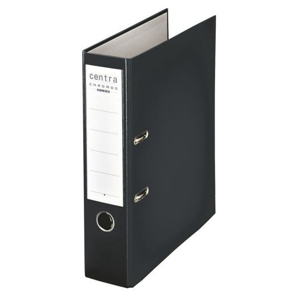 Ordner Plastik Chromos, mit Hebelmechnik. Mit Schlitzen, mit Griffloch, mit Kantenschutz, mit Sichttasche am Rücken und auswechselbarem Rückenschild. Material: Einband mit umweltschonender Polypropylen-Folie kaschiert, innen Polyethylen-beschichtetes, graues Papier. Format: für A4, 317 x 285 mm, Rückenbreite: 80 mm. Farbe: schwarz.
