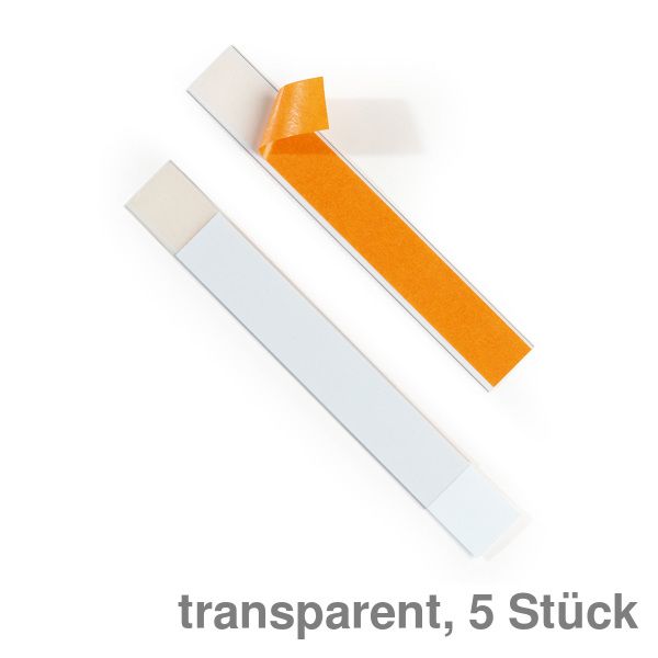 Individuell zuschneidbarer Schilderrahmen. Seitlich offen. Zum Kennzeichnen von Regalen, Schränken, Behältern etc. Aus transparentem PVC. Selbstklebend. Inkl. Blanko-Einsteckschild.