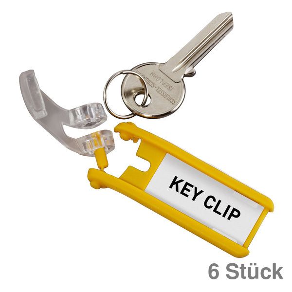 Schlüsselanhänger KEY CLIP. Permanent sichtbares Beschriftungsfeld, da der Schlüssel flach dahinter liegt. Austausch des Schildes durch einfachen Click, ohne Abnahme des Schlüsselrings. Mit Präzisionsvertiefungen zum sicheren Halt an den Schlüsselleisten in der KEY BOX oder am KEY BOARD. Kostenfreies Software-Download unter www.durable.de. Werkstoff: hochwertiger Kunststoff. Größe: 70 x 25 mm. Farbe: gelb