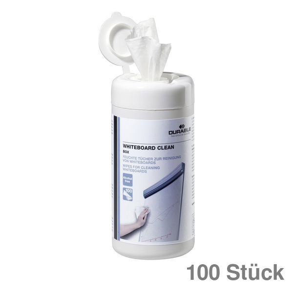 Reinigungstuch WHITEBOARD BOX. Ausführung des Reinigungsproduktes: getränkte Vliestücher. Zur Reinigung und Pflege von Whiteboards, alkoholfrei und fusselfrei, 130 x 180 mm.