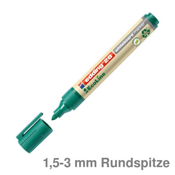 Whiteboardmarker 28 EcoLine. Geeignet für Beschriftungen und Markierungen auf geschlossenen Oberflächen, z.B. Whiteboards/ weißen Emaille-Tafeln und Glas. Geruchsarme Tinte ohne Zusatz von Butylacetat. Kann einige Tage offen liegen bleiben, ohne einzutrocknen. Lichtbeständig und schnelltrocknend. Trocken abwischbar von fast allen geschlossenen Oberflächen. Die Kunststoffteile des Markers bestehen insgesamt mindestens zu 90% aus recyceltem Material (83% post-consumer). Rundspitze, Spitze austauschbar. Nachfüllbarer Marker für Whiteboards. Papieretikett. Filtersystem, Filterfasern aus recyceltem Material. Kappe und Mundstück in Schreibfarbe. Kappe umsteckbar, Clip vorhanden. Kunststoffschaft. Schaftfarbe: umweltfreundliches Design. Strichstärke: 1,5 - 3 mm. Schreibfarbe: grün.
