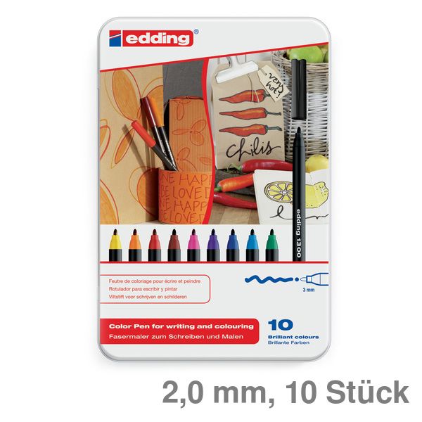 Fasermaler edding 1300 color pen. Ideal für das Anfertigen von Zeichnungen, Schriften, Skizzen, Modezeichnungen und Effektvollen Layouts. Fasermaler mit schwarzem Kunststoffschaft und formstabiler Rundspitze. Auswaschbare Tinte auf Wasserbasis. Hohe Lichtbeständigkeit. Strichstärke: ca. 2 mm. Schreibfarben: schwarz, rot, blau, grün, gelb, orange, braun, violett, rosa, hellblau.