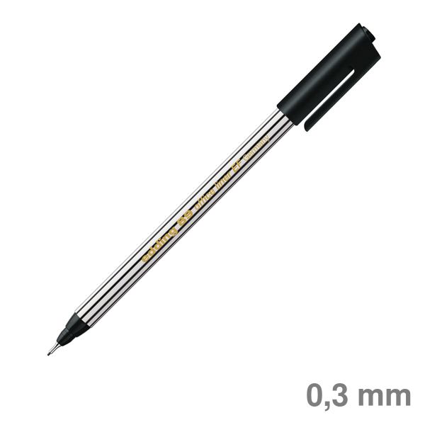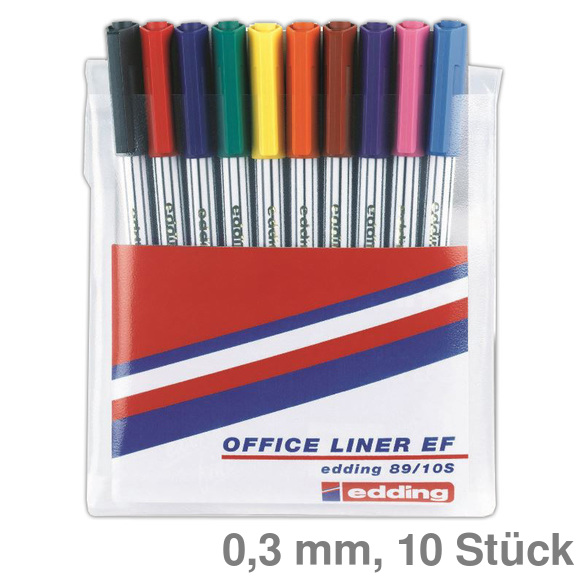 Fineliner 89 office liner EF. Kappenmodell. Einwegfineliner mit metallgefasster Kunststoffspitze. Tinte auf Wasserbasis. Schwarz-weiß gestreifter Kunststoffschaft. Umsteckbare Kunststoff-Clipkappe in Schreibfarbe. Strichstärke: 0,3 mm. Schreibfarbe: schwarz.