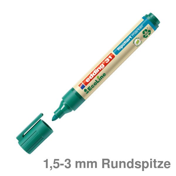 Flipchart marker 31 EcoLine. Geeignet für die Anwendung auf Papier, z.B. Flipcharts, Präsentationspapier und -karten und anderen Papierbögen. Geruchsneutrale Tinte auf Wasserbasis. Kann einige Tage offen liegen bleiben ohne einzutrocknen. Schreibt flüssig und mit kräftigen Farben. Tinte schlägt nicht auf nachfolgende Seiten durch. Die Kunststoffteile des Markers bestehen insgesamt mindestens zu 90% aus recyceltem Material (83% post-consumer). Rundspitze, Spitze austauschbar. Nachfüllbarer Marker für Flipcharts. Papieretikett. Filtersystem, Filterfasern aus recyceltem Material. Kappe und Mundstück in Schreibfarbe. Kappe umsteckbar, Clip vorhanden. Schaftfarbe: umweltfreundliches Design. Kappe und Mundstück in Schreibfarbe. Strichstärke: 1,5 - 3 mm. Schreibfarbe: grün