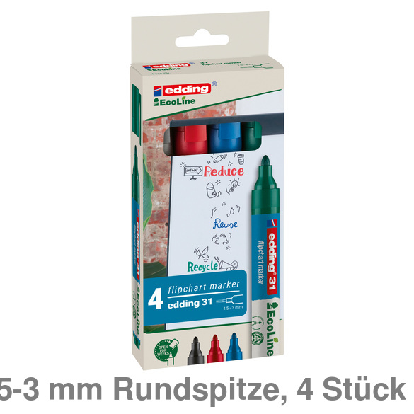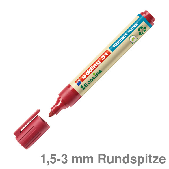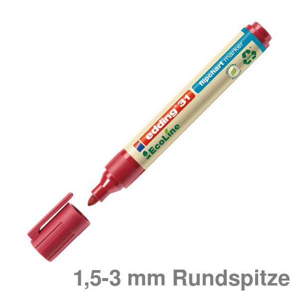 Flipchart marker 31 EcoLine. Geeignet für die Anwendung auf Papier, z.B. Flipcharts, Präsentationspapier und -karten und anderen Papierbögen. Geruchsneutrale Tinte auf Wasserbasis. Kann einige Tage offen liegen bleiben ohne einzutrocknen. Schreibt flüssig und mit kräftigen Farben. Tinte schlägt nicht auf nachfolgende Seiten durch. Die Kunststoffteile des Markers bestehen insgesamt mindestens zu 90% aus recyceltem Material (83% post-consumer). Rundspitze, Spitze austauschbar. Nachfüllbarer Marker für Flipcharts. Papieretikett. Filtersystem, Filterfasern aus recyceltem Material. Kappe und Mundstück in Schreibfarbe. Kappe umsteckbar, Clip vorhanden. Schaftfarbe: umweltfreundliches Design. Kappe und Mundstück in Schreibfarbe. Strichstärke: 1,5 - 3 mm. Schreibfarbe: rot