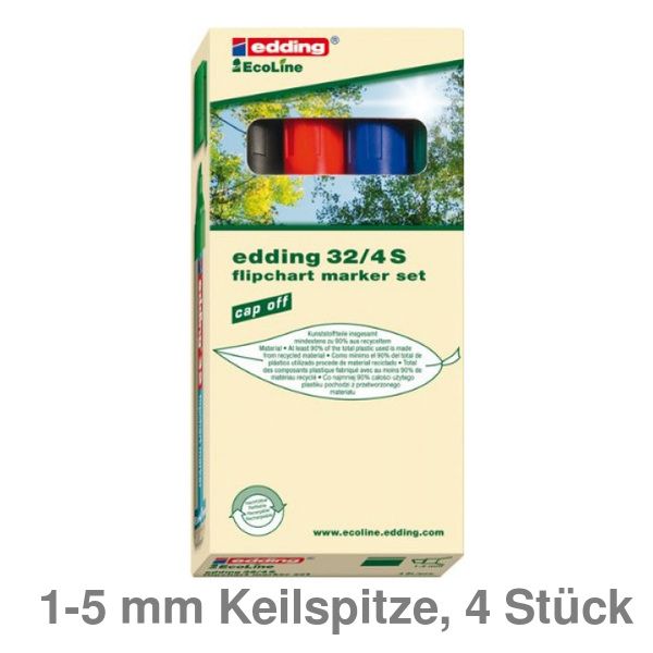 Flipchart marker 32 EcoLine. Geeignet für die Anwendung auf Papier, z.B. Flipcharts, Präsentationspapier und -karten und anderen Papierbögen. Geruchsneutrale Tinte auf Wasserbasis. Kann einige Tage offen liegen bleiben ohne einzutrocknen. Schreibt flüssig und mit kräftigen Farben. Tinte schlägt nicht auf nachfolgende Seiten durch. Die Kunststoffteile des Markers bestehen insgesamt mindestens zu 90% aus recyceltem Material (83% post-consumer). Keilspitze, Spitze austauschbar. Nachfüllbarer Marker für Flipcharts. Papieretikett. Filtersystem, Filterfasern aus recyceltem Material. Kappe und Mundstück in Schreibfarbe. Kappe umsteckbar, Clip vorhanden. Schaftfarbe: umweltfreundliches Design. Kappe und Mundstück in Schreibfarbe. Strichstärke: 1 - 5 mm. Schreibfarbe: schwarz, rot, blau, grün.