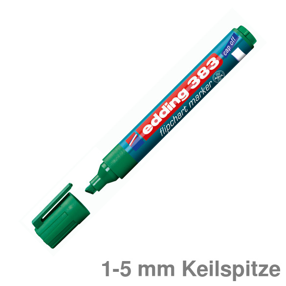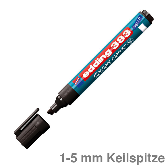 Flipchartmarker 383. Nachfüllbar. Geruchsneutrale Tinte auf Wasserbasis. Kann einige Tage offen liegen bleiben, ohne einzutrocknen. Keilspitze, Spitze austauschbar. Kunststoffschaft. Kappe umsteckbar, Clip vorhanden. Schaftfarbe: türkis. Strichstärke: 1 - 5 mm. Schreibfarbe: rot.