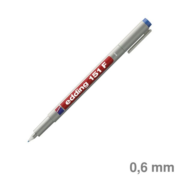 Non-permanent Pen edding 151 F. Folienschreiber mit Rundspitze speziell zur Beschriftung von Kunststoff-Folien unter anderem OHP-Folien, sowie vielen anderen Materialien, wie z.B. Glas. Wischfeste, wasserlösliche, schnelltrocknende Tinte. feucht abwischbar von fast allen geschlossenen Oberflächen. Hellgraue Kappe mit Kunststoffclip. Schaftfarbe: hellgrau. Strichstärke: 0,6 mm. Schreibfarbe: blau