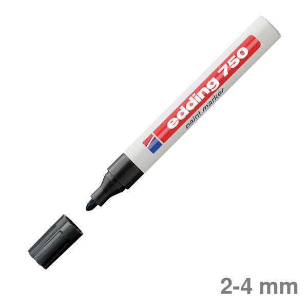 Lackmarker 750. Permanente, geruchsarme, lackartig deckende Tinte ohne Zusatz von Xylol Toluol, wasserfest , Hitzebeständig bis 400°. Rundspitze, Spitze austauschbar . Folienversiegelung. Laufbeschriftung enthält Piktogramme zur Anwendungserklärung für das Aktivieren der Lackmarker. Extrem Lichtbeständig. Stark deckend auch auf dunklen Oberflächen. Haftet auf glatten und porösen Oberflächen. Schaftmaterial: Aluminium. Schaftfarbe: weiß. Strichstärke: 2 - 4 mm. Schreibfarbe: schwarz.