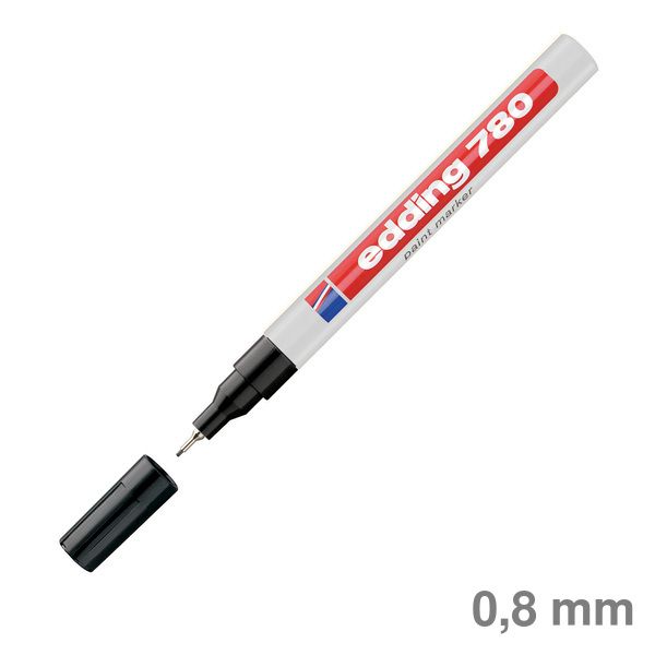 Lackmarker 780. Permanente, geruchsarme, lackartig deckende Tinte ohne Zusatz von Xylol Toluol, wasserfest , Hitzebeständig bis 400°. Rundspitze, Spitze austauschbar . Folienversiegelung. Laufbeschriftung enthält Piktogramme zur Anwendungserklärung für das Aktivieren der Lackmarker. Extrem Lichtbeständig. Stark deckend auch auf dunklen Oberflächen. Haftet auf glatten und porösen Oberflächen.. Schaftmaterial: Aluminium. Schaftfarbe: weiß. Strichstärke: 0,8 mm. Schreibfarbe: schwarz.
