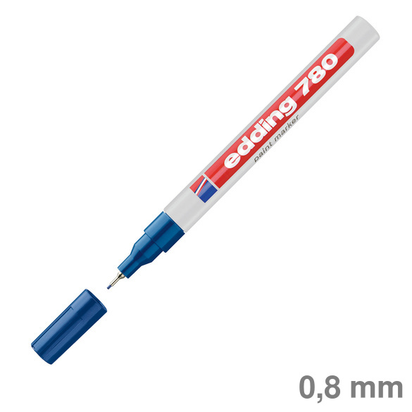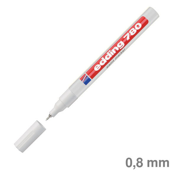 Lackmarker 780. Permanente, geruchsarme, lackartig deckende Tinte ohne Zusatz von Xylol Toluol, wasserfest , Hitzebeständig bis 400°. Rundspitze, Spitze austauschbar . Folienversiegelung. Laufbeschriftung enthält Piktogramme zur Anwendungserklärung für das Aktivieren der Lackmarker. Extrem Lichtbeständig. Stark deckend auch auf dunklen Oberflächen. Haftet auf glatten und porösen Oberflächen.. Schaftmaterial: Aluminium. Schaftfarbe: weiß. Strichstärke: 0,8 mm. Schreibfarbe: weiß.