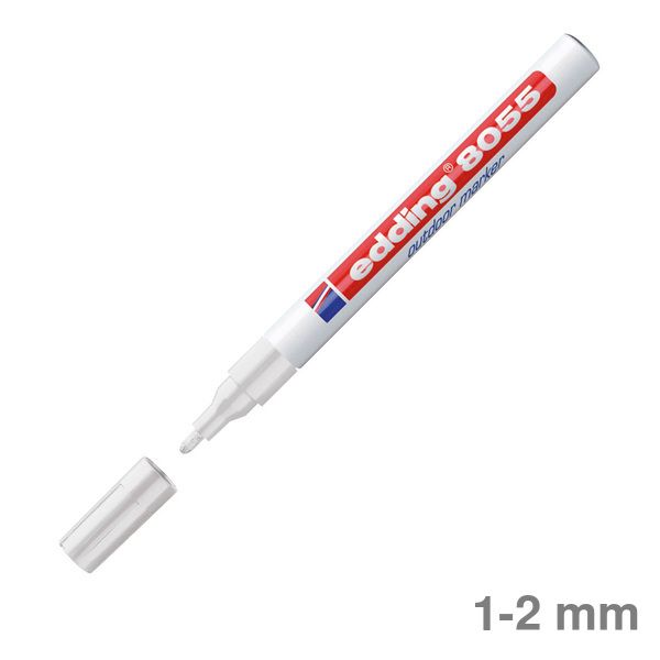 Lackmarker Outdoor marker 8055 Organisieren und Beschriften zu Hause. Permanente, geruchsarme, lackartig deckende Tinte ohne Zusatz von Xylol Toluol. Wasserfest, Hitzebeständig bis 400° °C. Lichtbeständig gegeben, wischfest. Rundspitze. Spitze austauschbar. Folienversiegelung. Kappe und Mundstück in Schreibfarbe. Laufbeschriftung enthält Piktogramme zur Anwendungserklärung für das Aktivieren der Lackmarker. Extrem Lichtbeständig. Stark deckend auch auf dunklen Oberflächen. Schaftematerial: Aluminium. Schaftfarbe: weiß. Strichstärke: 1-2 mm. Schreibfarbe: weiß.