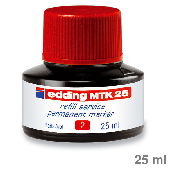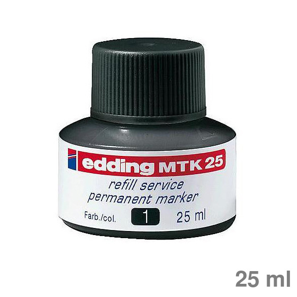 Nachfülltinte MTK 25 refill service. Zum Nachfüllen der Permanentmarker edding 21, 22, No.1, 400, 3000, 3300. Permanente, geruchsarme, lichtbeständige Tinte in einer Flasche mit Kapillarsystem. Marker einfach mit der Spitze nach unten in die Refillflasche stellen, nach mind. 1 Stunde ist der Marker wieder schreibbereit. Inhalt: 25 ml. Farbe: grün.