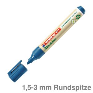 Permanentmarker 21 EcoLine. Zum Beschriften, Markieren und Kennzeichnen von fast allen Oberflächen, wie z.B. Papier, Kunststoff, Metall und Glas. Geruchsarme Tinte ohne Zusatz von Xylol/Toluol. Wasserfest, abbriebbeständig und lichtbeständig. Schnelltrocknend. Die Kunststoffteile des Markers bestehen insgesamt mindestens zu 90% aus recyceltem Material (83% post-consumer). Rundspitze, Spitze austauschbar. Der Marker ist nachfüllbar. Papieretikett. Marker mit Filtersystem. Filterfasern aus recyceltem Material. Kappe umsteckbar, Clip vorhanden. Kappe und Mundstück in Schreibfarbe. Schaftfarbe: umweltfreundliches Design. Strichstärke: ca. 1,5 - 3 mm. Schreibfarbe: schwarz.