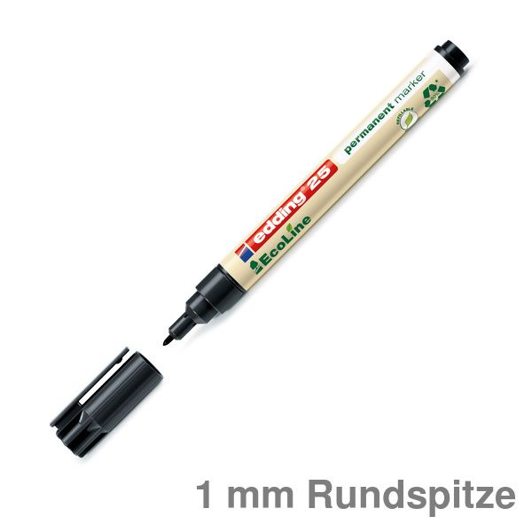 Permanentmarker 25 EcoLine. Besonders gut geeignet zum feinen Beschriften, Markieren und Kennzeichenn von fast allen Materialien, wie z.B. Papier, Kunststoff, Metall und Glas. Geruchsarme Tinte ohne Zusatz von Xylol/Toluol. Wasserfest und abbriebbeständig. Schnelltrocknend. Die Kunststoffteile des Markers bestehen insgesamt mindestens zu 90% aus recyceltem Material (83% post-consumer). Rundspitze, Spitze austauschbar. Der Marker ist nachfüllbar. Papieretikett. Marker mit Filtersystem. Filterfasern aus recyceltem Material. Kappe umsteckbar, Clip vorhanden. Kappe und Mundstück in Schreibfarbe. Schaftfarbe: umweltfreundliches Design. Strichstärke: 1 mm. Schreibfarbe: schwarz.
