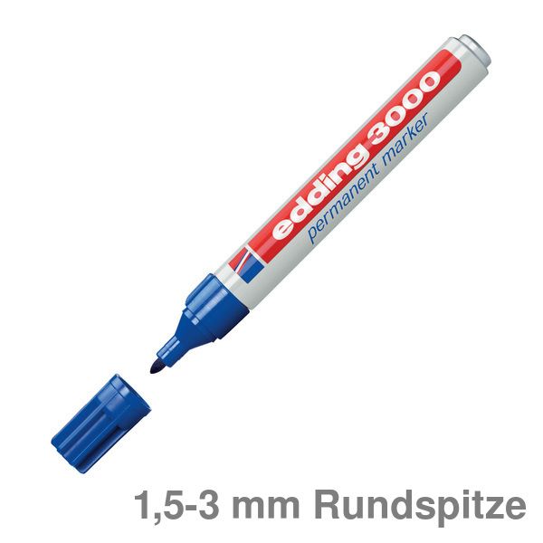 Permanentmarker 3000. Nachfüllbarer Marker zum Beschriften, Bemalen, Kennzeichnen von fast allen Materialien, auch Metall, Glas, Kunststoff. Permanente, geruchsarme Tinte ohne Zusatz von Toluol/Xylol, wisch- und wasserfest, lichtbeständig. Austauschbare Rundspitze. Aluminiumschaft. Umsteckbare Kappe in Schreibfarbe. Schaftfarbe: weiß . Strichstärke: ca. 1,5 - 3 mm. Schreibfarbe: blau.