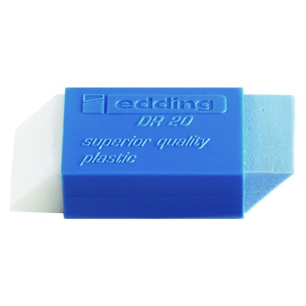 Radierer edding DR 20. Kombiradierer , Kunststoff. Kunststoffradierer für Bleiradierungen und Tinten-, Farb-, Kopier-und Malstifte. Für Zeichnungsträger: Papier, mattierte Zeichenfolie. Abgeschrägte Kante für angenehmes und punktgenaues radieren.. Kunststoff. Farbe: transparent / blau. Größe (B x T x H): 20 x 52 x 10 mm.
