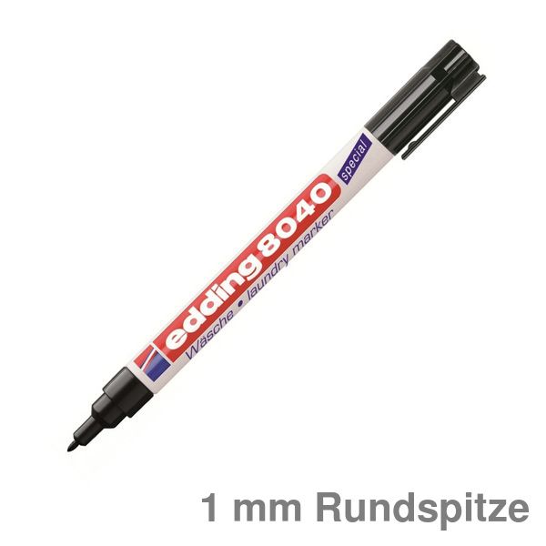 Wäschemarker 8040. Bis zu einer Waschtemperatur von 90 Grad, Geruchsarme Tinte auf Alkoholbasis ohne Zusatz von Toluol/Xylol. Rundspitze. Spezialmarker zum Beschriften von Textilien. Belüftete Kappe nach ISO 11540. PP - Schaft receycelbar. Lichtbeständig. Schonend zur Faser. Schnell trocknend.. Mit Clip , Kunststoff. Schaftfarbe: weiß. Strichstärke: 1 mm. Schreibfarbe: schwarz.