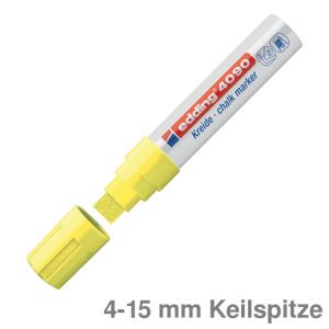 Kreidemarker 4095. Fenster-/ Kreidemarker zum Gestalten, Verzieren und Beschriften von Fenstern, Glas, Tafeln und anderen geschlossenen Oberflächen. Gut deckende, geruchsneutrale Flüssigkreide auf Wasserbasis. Feucht abwischbar von fast allen geschlossenen Oberflächen. Rundspitze. Ventilgesteuerter Kreidefluss. Weißer Kunststoffschaft mit Kunststoffkappe in Schreibfarbe. Strichstärke: 2 - 3 mm. Schreibfarbe: neongelb.