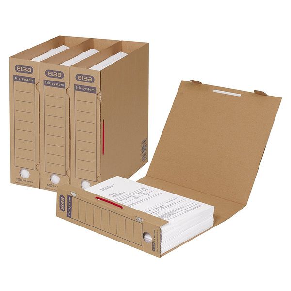 Für ca. 500 DIN A4-Blätter. Mit für Ordnerfüllungen, die mit dem ELBA Bündelungsbügel 83 529 gebündelt sind. Mit Verschlusslasche und Greifloch. Mit Archivdruck. Lieferung ohne Bündelungsbügel. Aus stabiler Wellpappe. Für A4. Größe: 78 x 288 x 314 mm (B x T x H). Farbe: naturbraun. Flachliegend im Transportkarton verpackt.