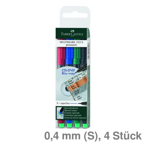 4er Etui MULITMARK permanent S. Art der Schreibflüssigkeit: Tinte auf Alkoholbasis, wasserfest. Ausführung der Spitze: Kunststoffgefasste Hartplastikspitze. Ideal für Folien, CD's und alle glatten Flächen. Mit integriertem Spezialradierer. Leuchkräftig, farbintensiv, randscharf und sekundenschnell trocknend.. Material des Schaftes: Polypropylen. Ausführung der Griffzone: Angeraute runde Griffzone. Kappe umsteckbar. Clip vorhanden. Farbe des Schaftes: schwarz. Strichstärke: 0,4. Schreibfarbe von Schreibgeräten: sortiert.