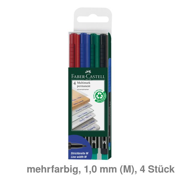 MULITMARK permanent M. Art der Schreibflüssigkeit: Tinte auf Alkoholbasis, wasserfest. Ausführung der Spitze: Faserspitze. Ideal für Folien, CD's und alle glatten Flächen. Mit integriertem Spezialradierer. Leuchkräftig, farbintensiv, randscharf und sekundenschnell trocknend. Material des Schaftes: Polypropylen. Ausführung der Griffzone: Angeraute runde Griffzone. Kappe umsteckbar. Clip vorhanden. Farbe des Schaftes: schwarz. Strichstärke: 1,0 mm. Schreibfarbe: sortiert.
