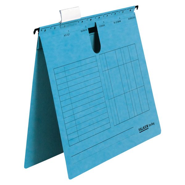 Hängehefter UniReg. Art der Heftung: kaufmännische Heftung. Karton, Metall. Organisationsaufdruck vorhanden. Werkstoff: Manila-RC-Karton. Flächenmasse des Papiers: 230 g/qm. Verwendung für Papierformate: DIN A4. Farbe: blau. Zertifikate und Zulassungen: Blauer Engel.