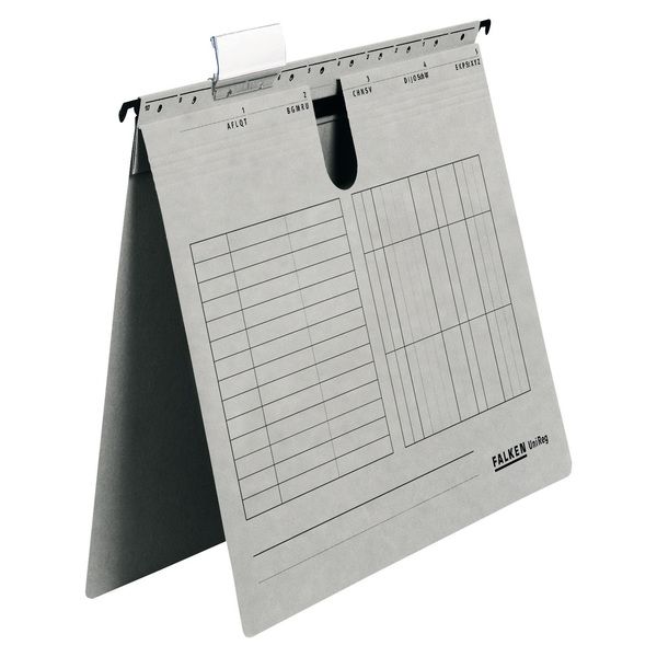 Hängehefter UniReg. Art der Heftung: kaufmännische Heftung. Karton, Metall. Organisationsaufdruck vorhanden. Werkstoff: Manila-RC-Karton. Flächenmasse des Papiers: 230 g/qm. Verwendung für Papierformate: DIN A4. Farbe: grau. Zertifikate und Zulassungen: Blauer Engel.