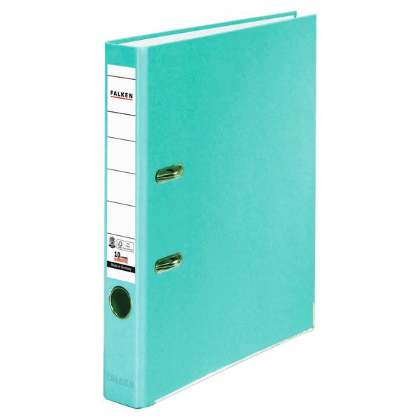 Ordner S50 Recycolor. Material der Kaschierung außen: Spezial-Kraftpapierbezug (biologisch abbaubar). Strapazierfähig und wischfest. Ausführung: Qualitätshebelmechanik mit Funktionsgarantie; Griffloch, Schlitze und Kantenschutz vorhanden. Verwendung für Papierformate: DIN A4. Breite des Rückens: 50 mm. Farbe: mint. Zertifikate und Zulassungen: Forest Stewardship Council (FSC), Blauer Engel, LGA Qualitäts-Zertifikat.