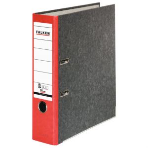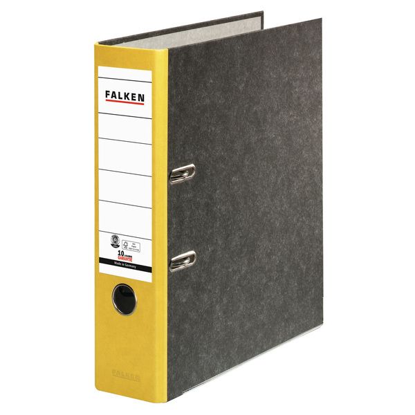 Ordner S80 Recycling. Werkstoff: stabiler Pappkern. Material der Kaschierung außen: griffig genarbter Papierbezug. Ausführung: Qualitätshebelmechanik mit Funktionsgarantie; Griffloch, Schlitze und Kantenschutz vorhanden. Verwendung für Papierformate: DIN A4. Breite des Rückens: 80 mm. Farbe des Ordners: grau marmoriert, Farbe des Rückens: gelb. Zertifikate und Zulassungen: Forest Stewardship Council (FSC), Blauer Engel, LGA Qualitäts-Zertifikat.