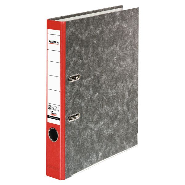 Ordner S50 Recycling. Werkstoff: stabiler Pappkern. Material der Kaschierung außen: griffig genarbter Papierbezug. Ausführung: Qualitätshebelmechanik mit Funktionsgarantie; Griffloch, Schlitze und Kantenschutz vorhanden. Verwendung für Papierformate: DIN A4. Breite des Rückens: 50 mm. Farbe des Ordners: grau marmoriert, Farbe des Rückens: rot. Zertifikate und Zulassungen: Forest Stewardship Council (FSC), Blauer Engel, LGA Qualitäts-Zertifikat.