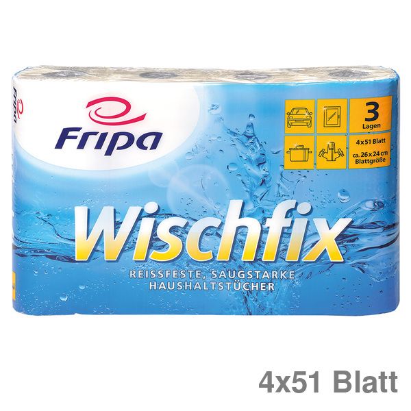 Die Haushaltstücher Fripa Wischfix nehmen ihren Namen beim Wort: Sie kombinieren Saugkraft und Sauggeschwindigkeit so optimal, dass kein Tropfen übrig bleibt.