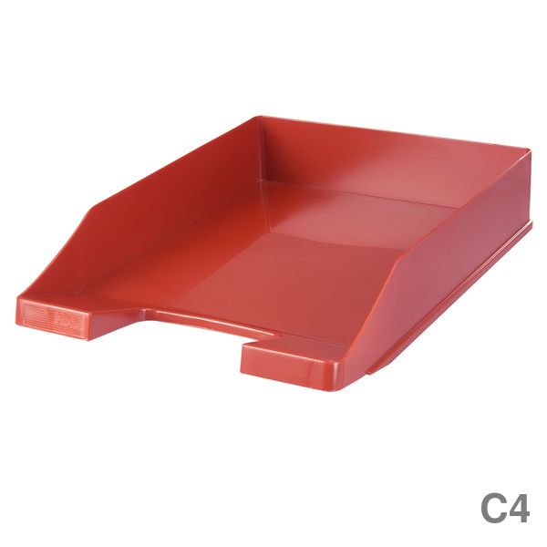 Briefablage KLASSIK, DIN A4/C4. Die klassische Briefablage in zeitgemäßem Design. In hochglänzender Optik. Solider und langlebiger Ordnungshelfer für jedes Büro. Hat Klasse, zeigt Klasse, ist klasse! Senkrecht oder versetzt stapelbar. Mit breitem Greifausschnitt für leichte Orientierung und optimalen Zugriff auf die Unterlagen. Die leicht angeschrägte Vorderfront der Briefablage verhindert ein Herausrutschen der Dokumente. Kompatibel zu allen gängigen Briefablagen. Platz für Beschriftungsclip 1021. Verwendung für Papierformate: DIN A4/C4. Außenmaße (B x T x H): 255 x 348 x 65 mm. Material: hochwertiger Kunststoff, Polystyrol (PS). Farbe: rot