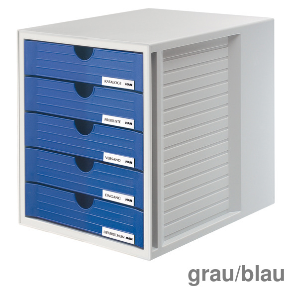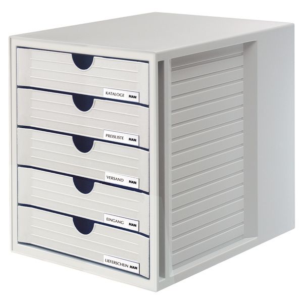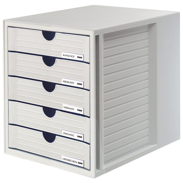 Schubladenbox SYSTEMBOX mit 5 geschlossenen Schubladen inkl. Beschriftungsclips (Art.-Nr. 1021) für Papierformat DIN A4 und größer. Innovatives, attraktives Design in höchster Qualität. Leichtlaufende Schubladen mit Auszugssperre und Griffloch für ein bequemes Entnehmen. Außenhöhe und -tiefe sind abgestimmt auf Ordnerhöhe bzw. auf ein Ordnerfach, somit ideal geeignet für den Schrankeinsatz. Extra stabile Verarbeitung. Stapelbar, dadurch Platz sparend. Rutschfeste, möbelschonende Gummifüße sorgen für einen sicheren Stand. Made in Germany. Außenmaße (B x T x H): 275 x 330 x 320 mm. Innenmaße der Schubladen (B x T x H): 238 x 305 x 45 mm, daher ein hohes Fassungsvolumen. Material: hochwertiger Kunststoff, Polystyrol (PS). Farbe des Gehäuses: lichtgrau. Farbe der Schubladen: lichtgrau