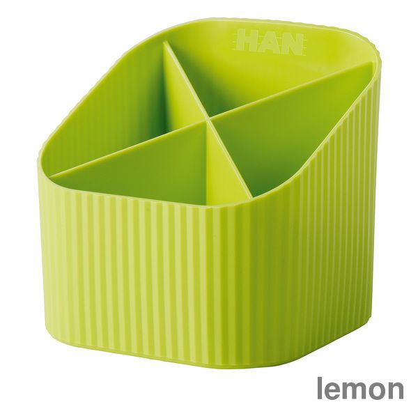 Nachhaltiger Schreibtischköcher aus qualitativ hochwertigem, recyceltem Öko-Kunststoff, im formschönen Design sorgt für Ordnung auf dem Schreibtisch. Die 4 unterschiedlich hohen Fächer bieten viel Platz für Stifte, Pinsel und viele weitere Utensilien. Ob für das Büro oder Zuhause. Der HAN Re-X-LOOP ist unempfindlich, stabil und langlebig. Der Schreibtischköcher HAN Re-X-LOOP ist umweltfreundlich und hilft somit wertvolle Ressourcen zu sparen.