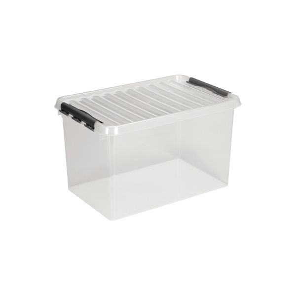 Aufbewahrungsbox mit Deckel, leicht aber stabil per Clip verschließbar. Gefüllt stapelbar und ungefüllt ineinander zu stellen. Durch die Transparenz sind die Boxen gut einsehbar. Werkstoff: Kunststoff. Farbe: transparent. Mit praktischem Griff zum Tragen. Maße: 40 x 42 x 60 cm