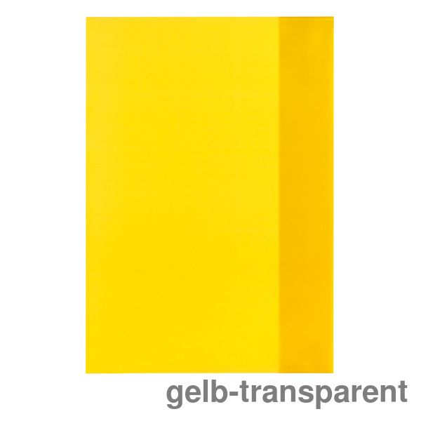 Hefthülle. Ausführung: Hüllen strapazierfähig, Papiereinlage vorhanden. Anordnung der Lage der Öffnungsseite: rechts und links. Ausführung der Lochung: keine Lochung. Verwendung für Papierformate: A5. Werkstoff: PP. Genarbt. Stärke: 90 my. Farbe: transparent gelb.